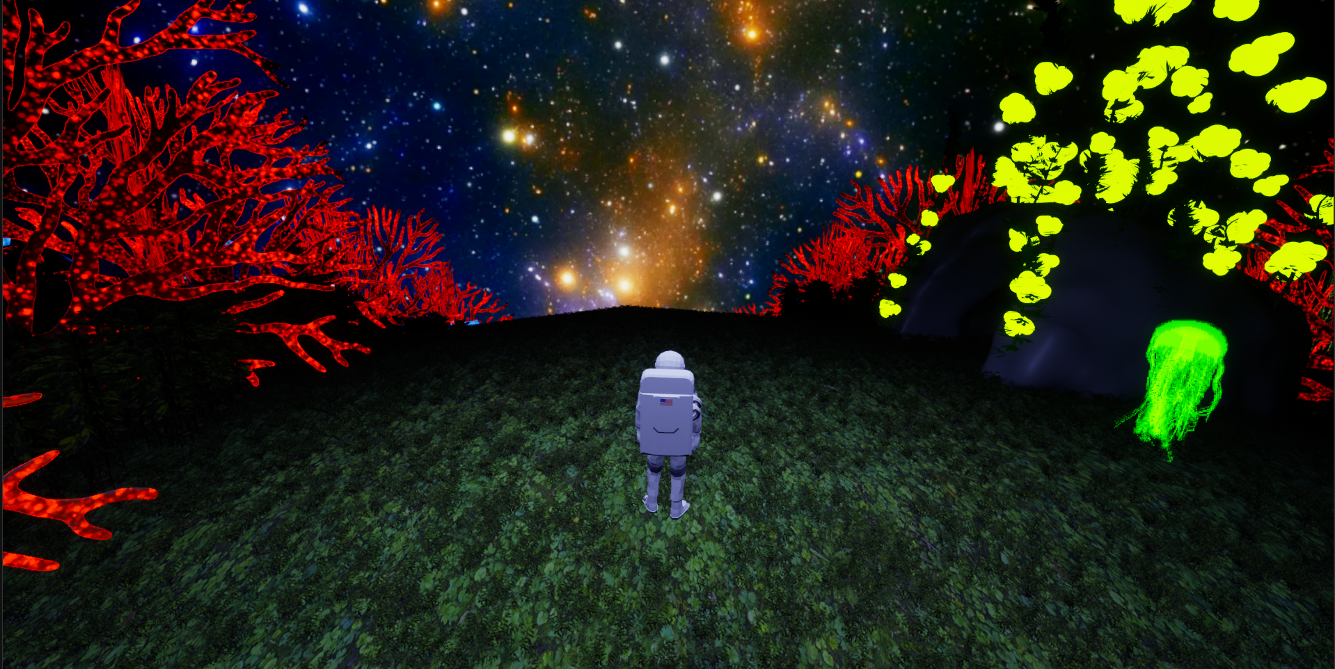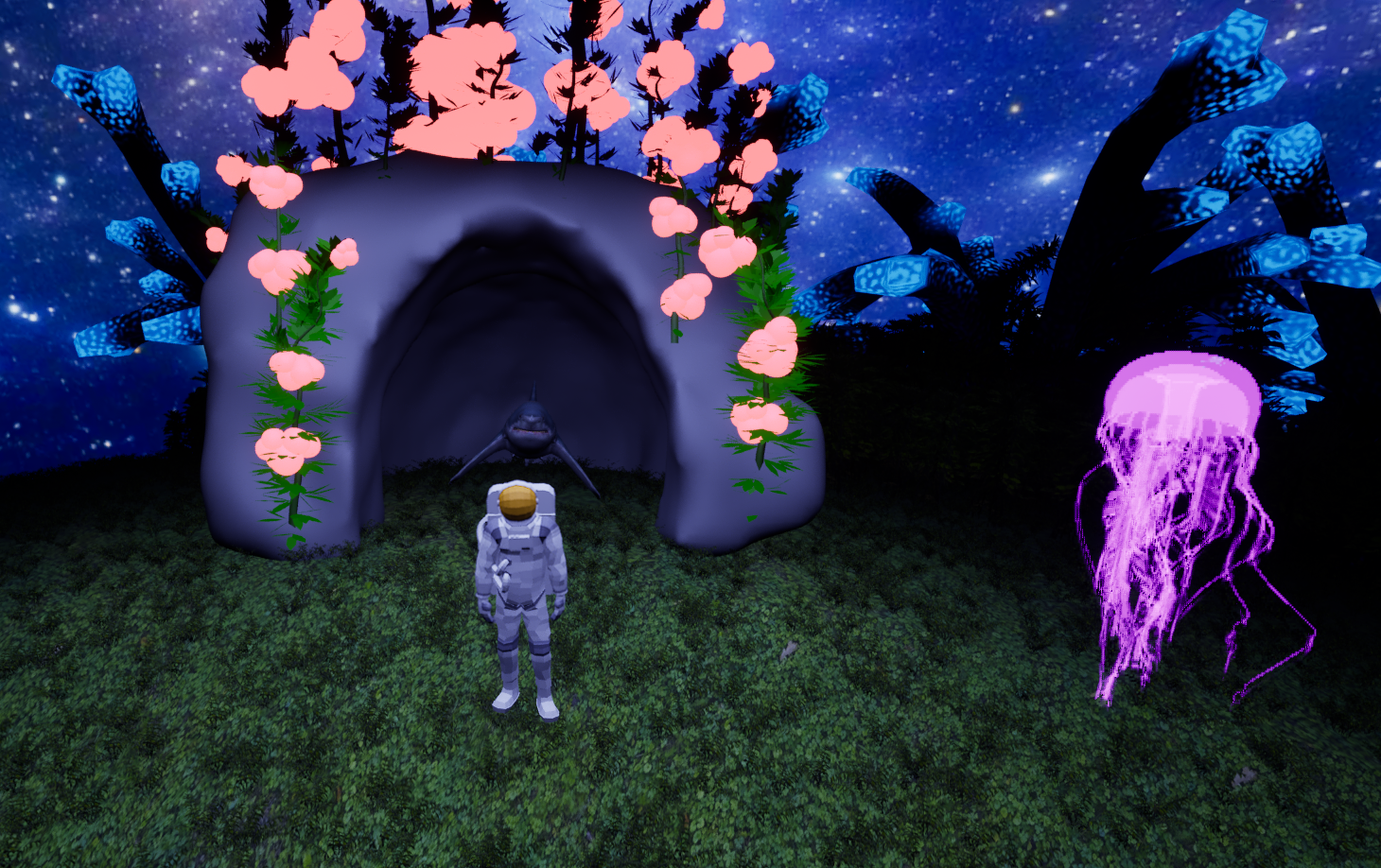 The player might have trouble orienting themselves on the planet. To mitigate this, I have made it so that the Shark Caves change color. Once the shark in the cave has been eliminated, the cave will turn green and stay green for the rest of the game. That way, the player can tell from a distance if they are going in a direction they have already been.