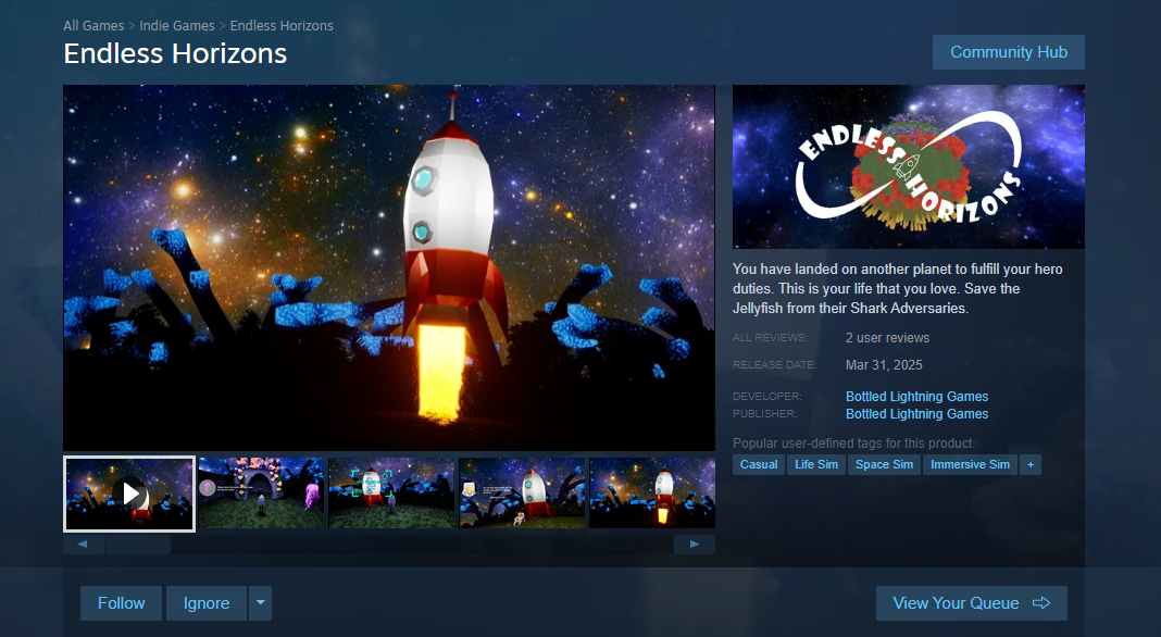 Description: Endless Horizons is a Narrative game where you play as Commander Storm, who lands on a planet to use his talents to help the local citizens. It is a commentary on how the constant seeking of validation from others can be a prison.