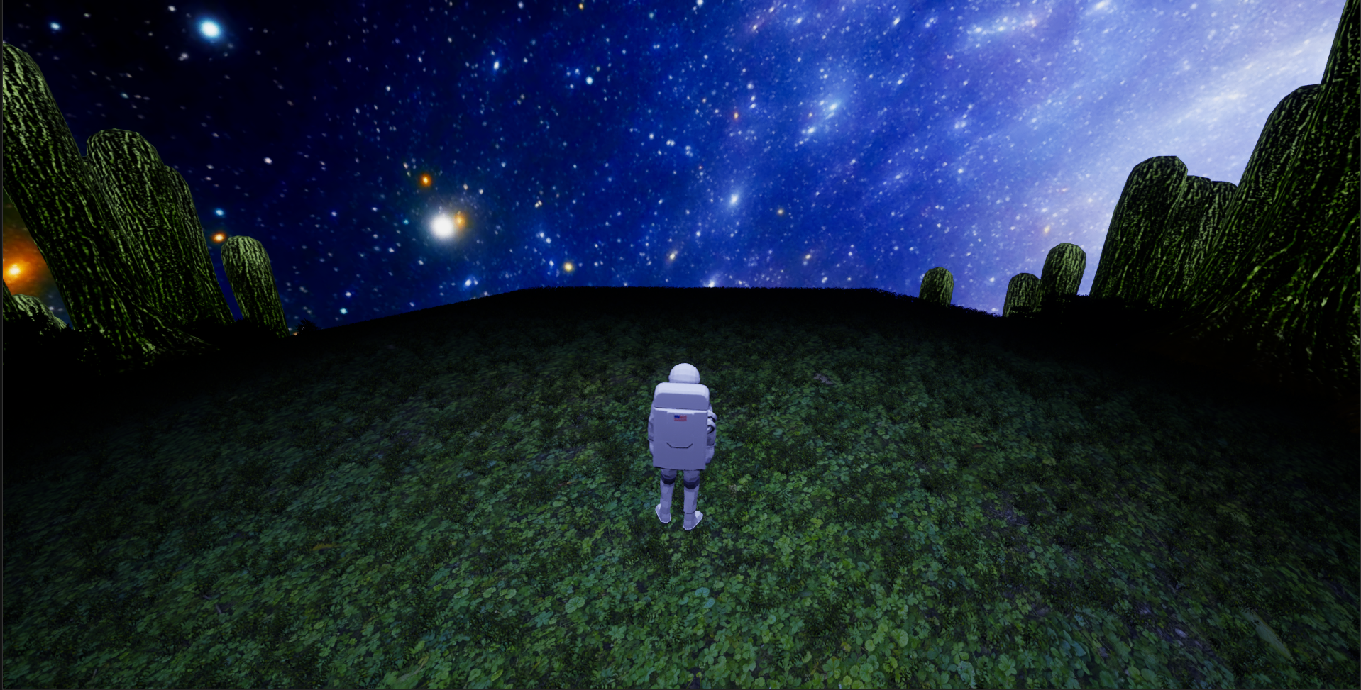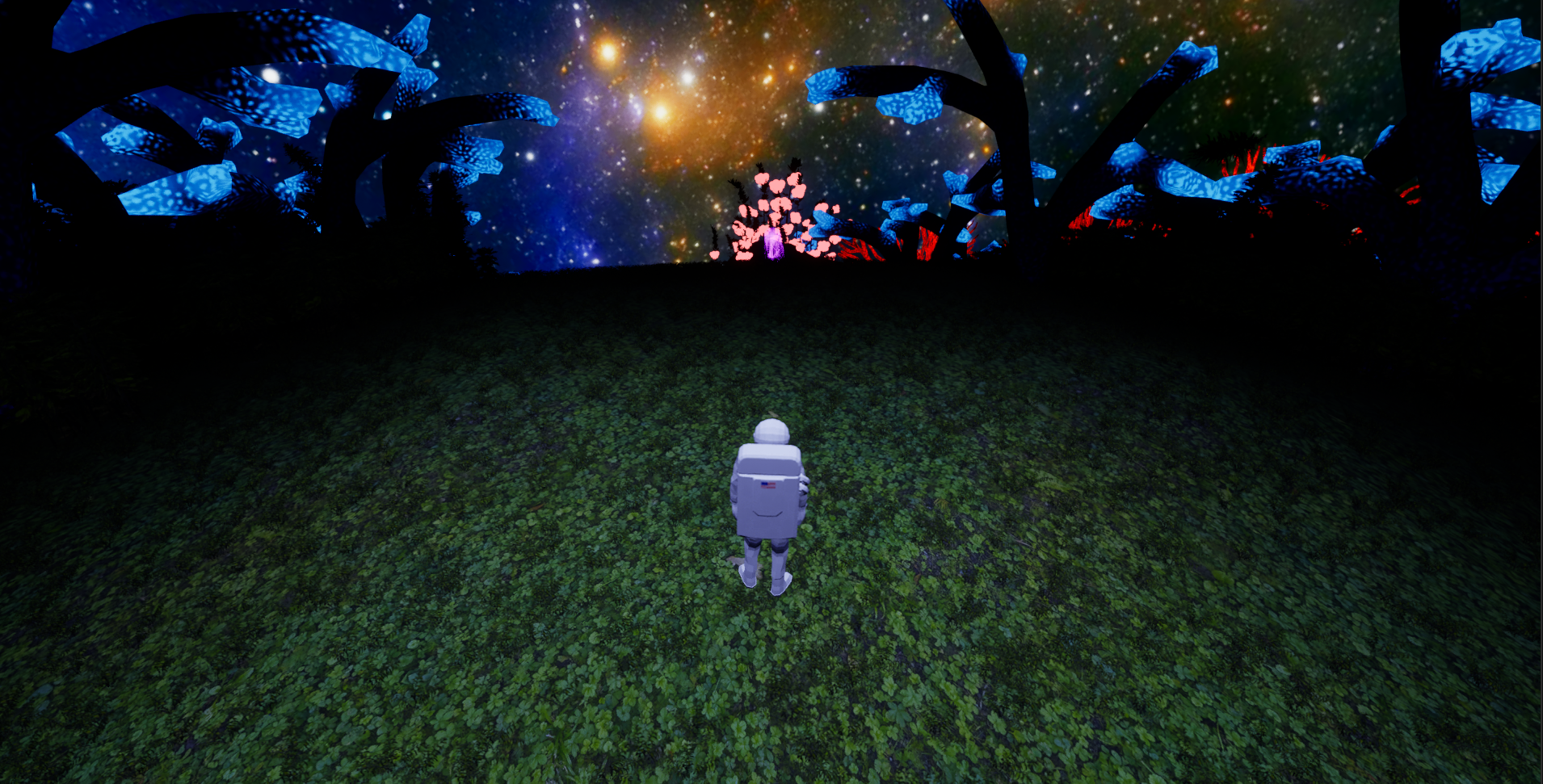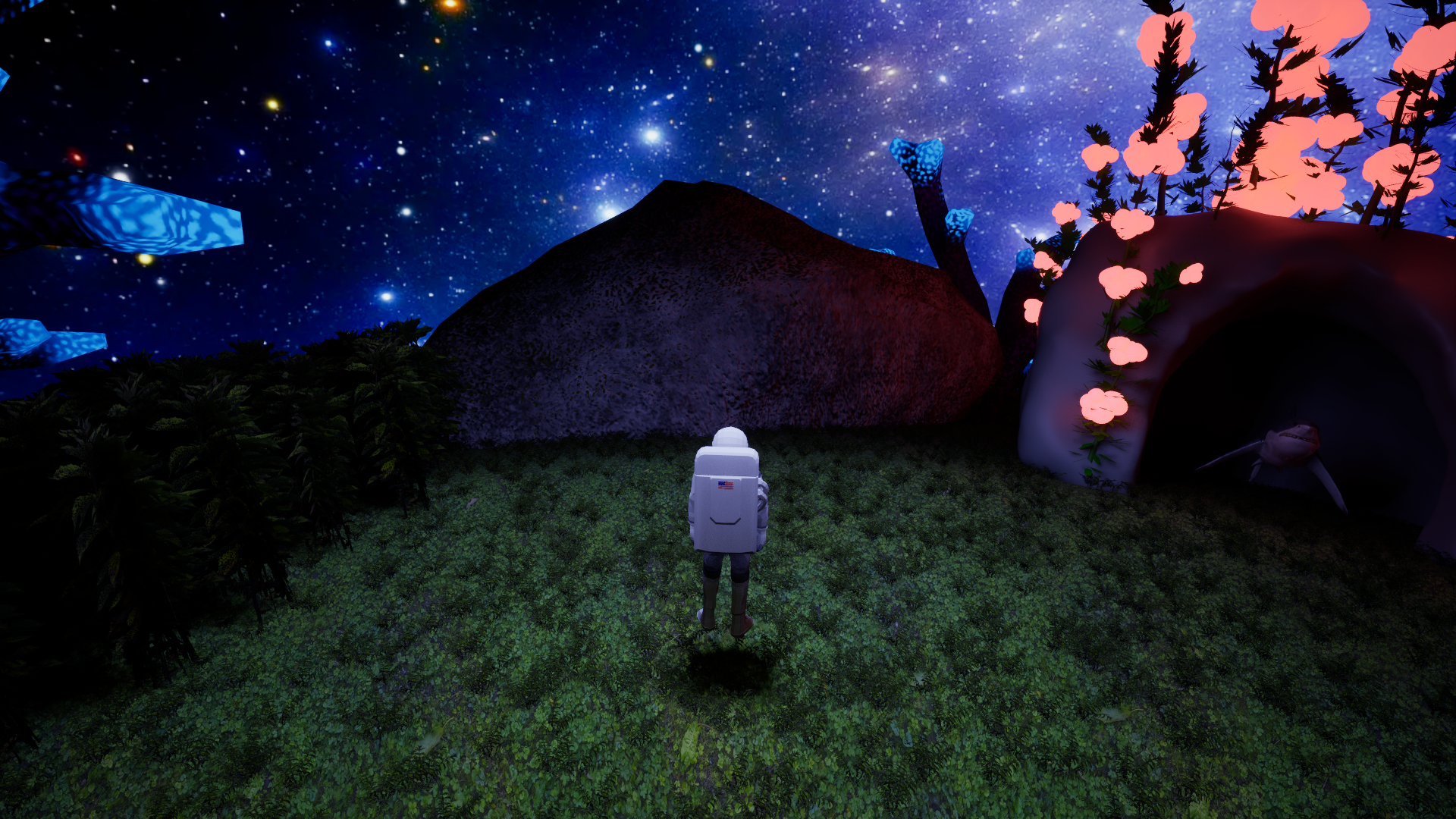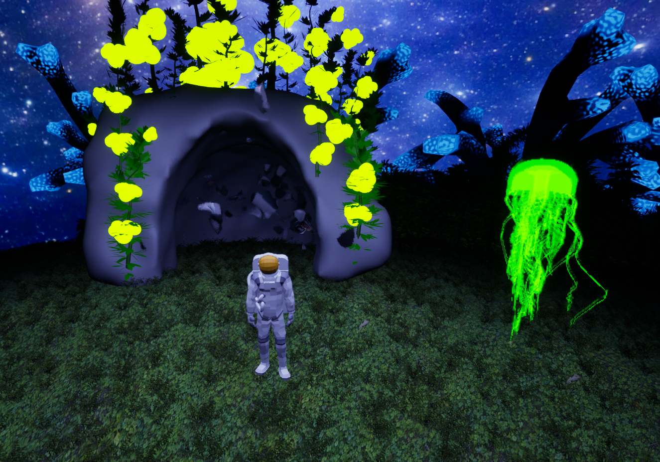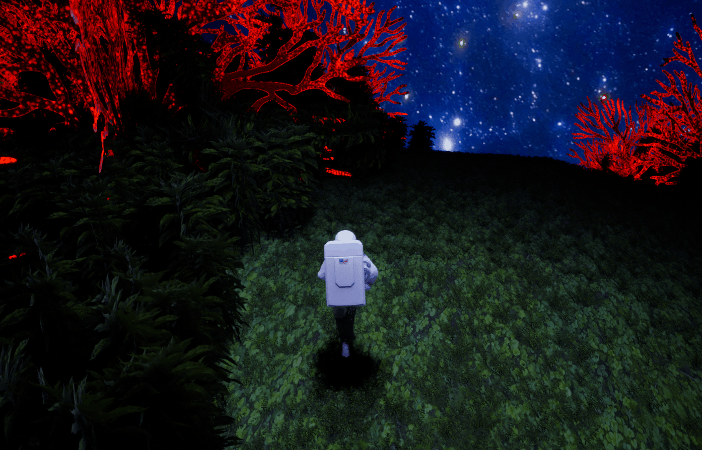 There are dark contrasting bushes that have collision to keep the player on a linear path. There are also massive rocks that hinder progression and keep the player from going to other sections until the player returns to the rocket. The rocks will disappear after the player hits a suitable threshold of gas containers.